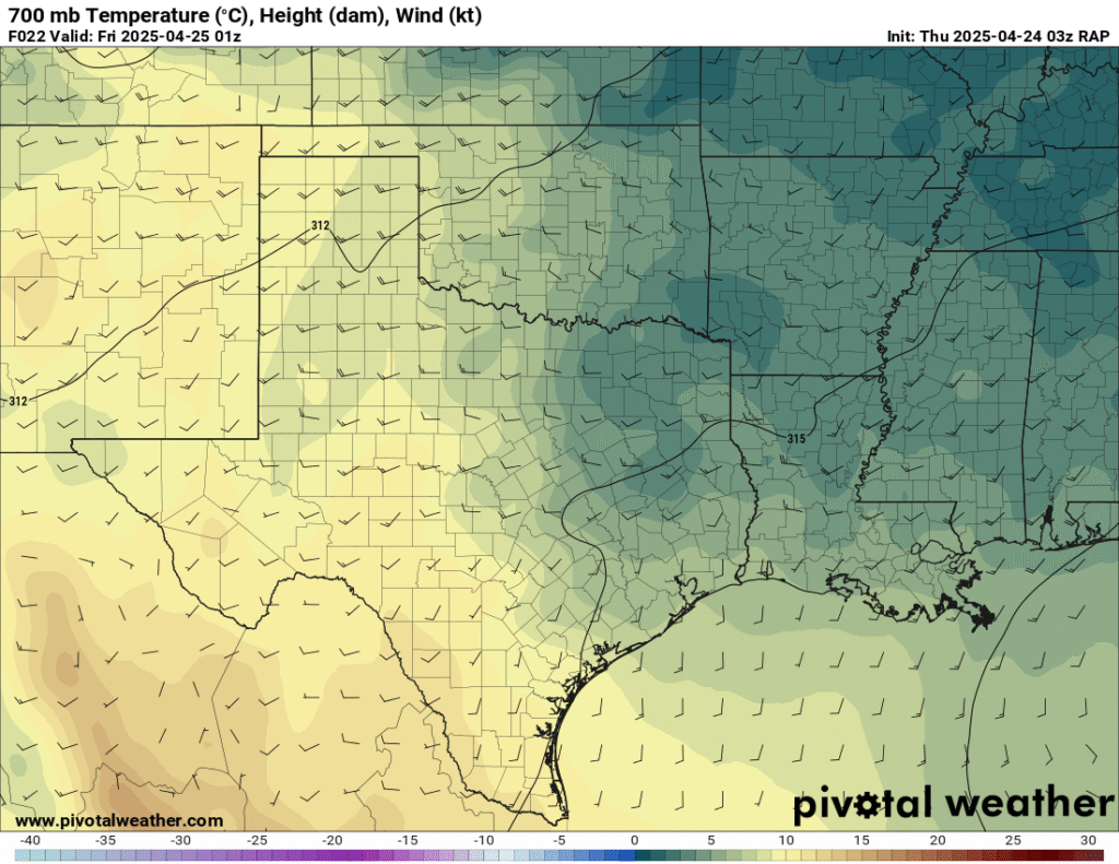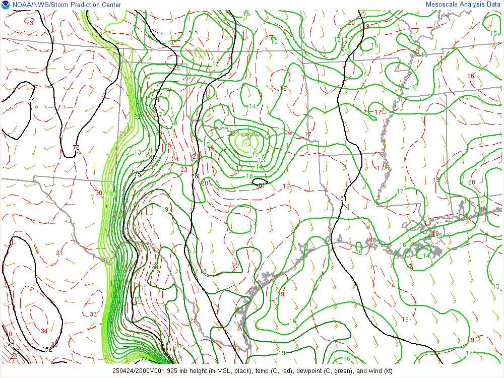 You can see the stable layer on the 12z Amarillo sounding. Above 750mb or so, lapse rates steepen up and flow turns generally westerly. Significant turning in the lower levels as the low deepens to the north. Fort Worth, Midland and Del Rio soundings all showing very good low level mixing ratios and deep moisture to work with.