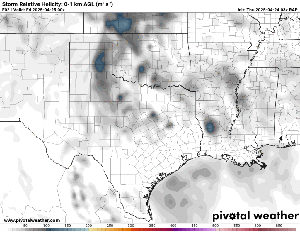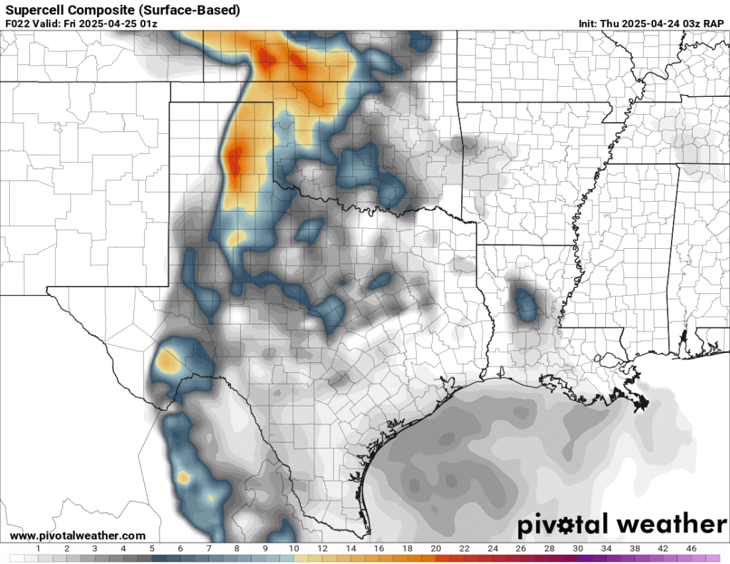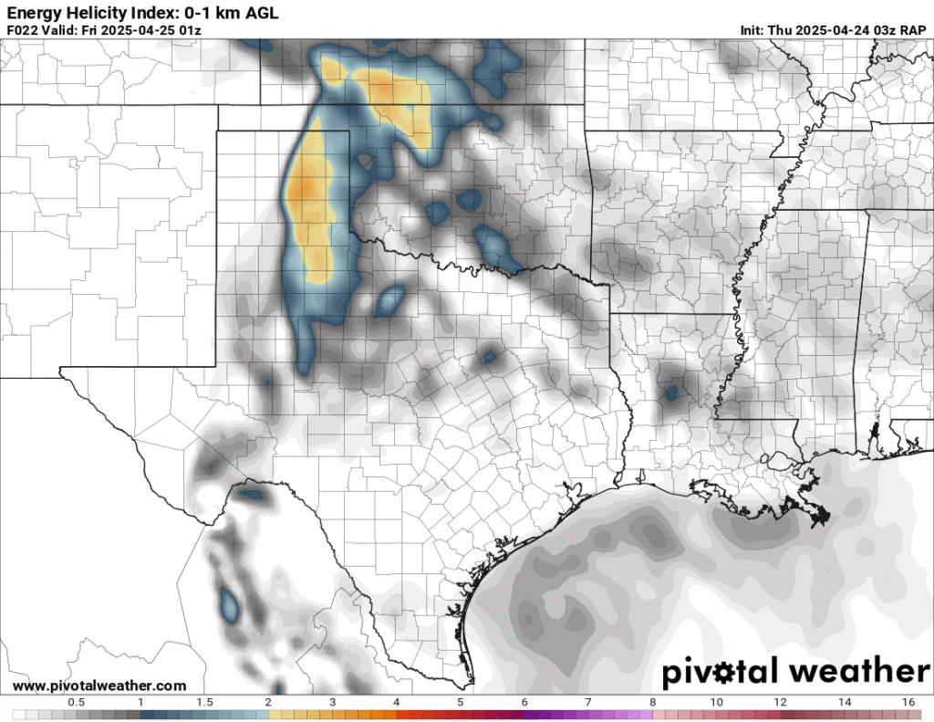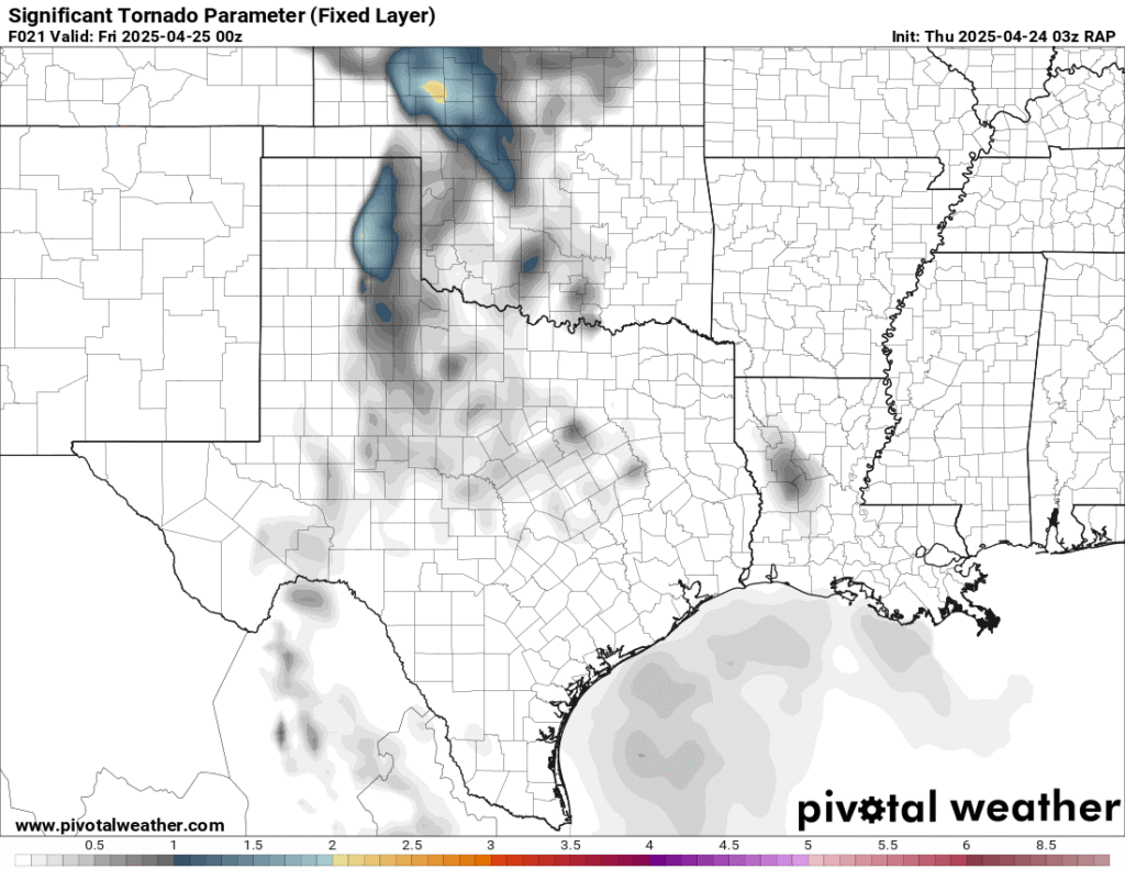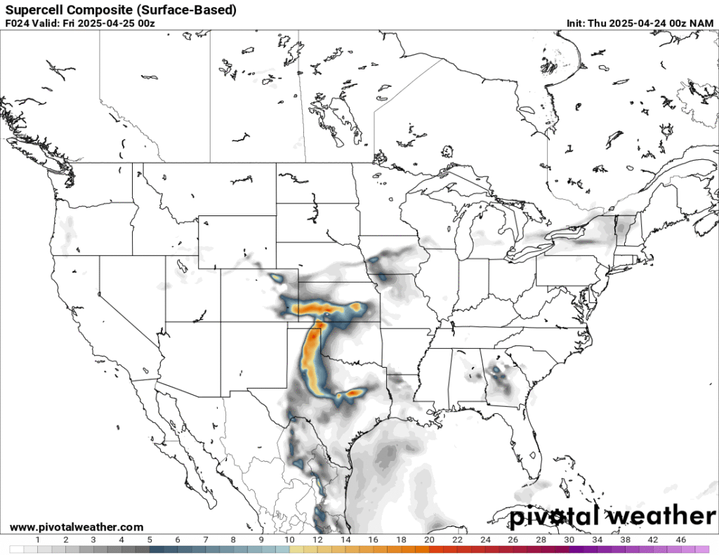 The nadocast was generally on the 24th, showing tornado potential throughout the Texas panhandle and even into Northwest Oklahoma. The later run also depicted potential all the way into Southwest Kansas.