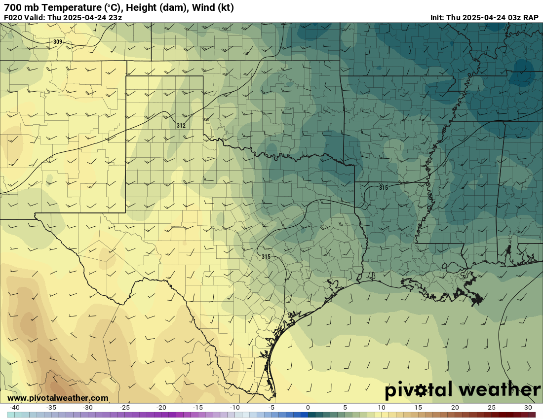 You can see the stable layer on the 12z Amarillo sounding. Above 750mb or so, lapse rates steepen up and flow turns generally westerly. Significant turning in the lower levels as the low deepens to the north. Fort Worth, Midland and Del Rio soundings all showing very good low level mixing ratios and deep moisture to work with.
