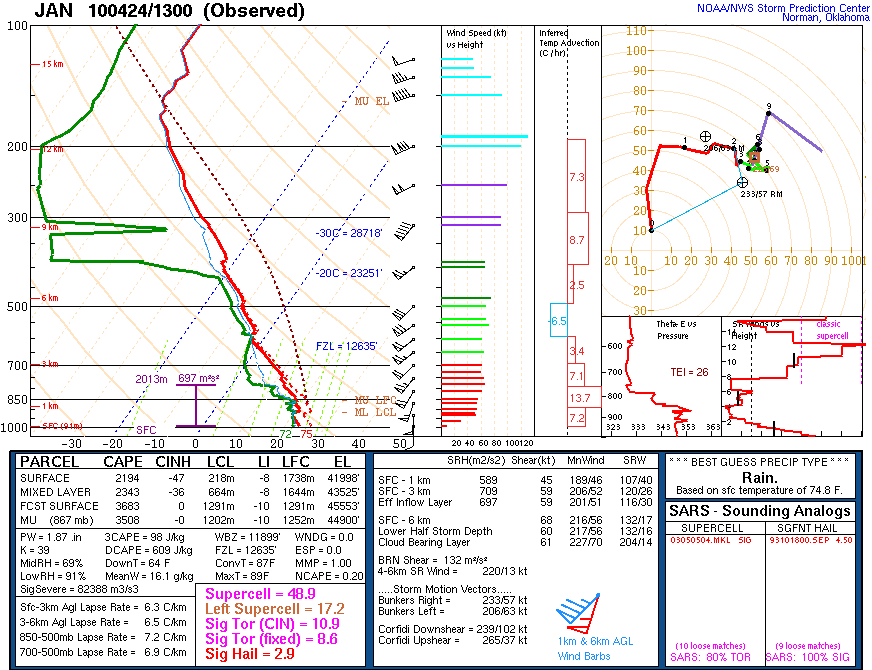 The 13Z (8am CDT) Jackson, MS sounding painted a very serious picture. With the moisture column almost saturated to 400mb, and a big curved hodograph, we knew we would be dealing with HP beast storms for the day.