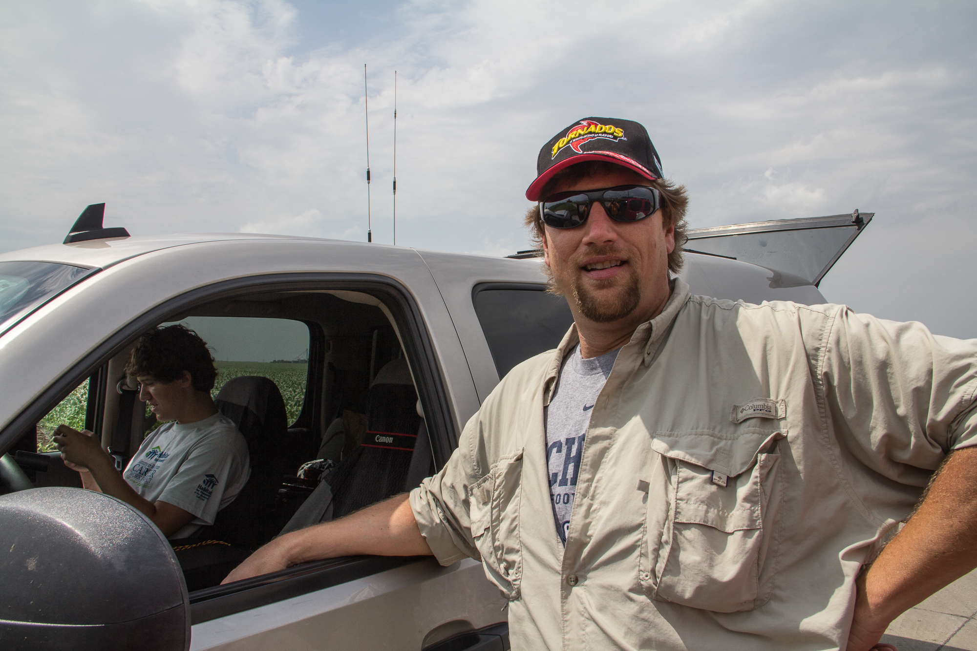 We got into hail, and Randy Cooper was reporting a cone tornado on the radio, so we were trying to figure out which direction we needed to look and go. I wanted to go west into the crap, JR wanted to go east. We ended up going east, and it turned out to be the correct choice.