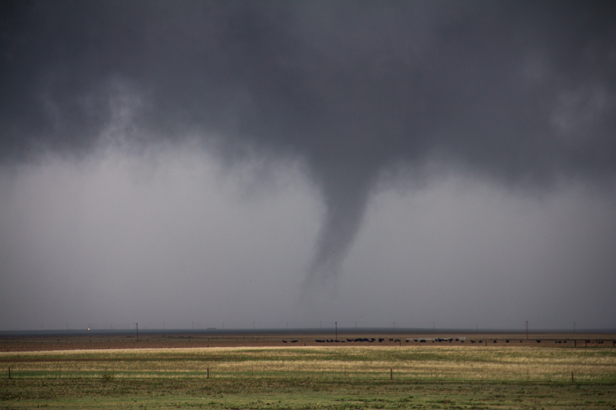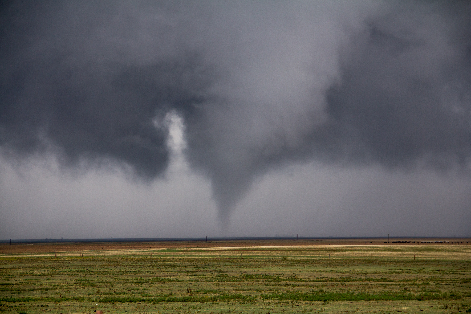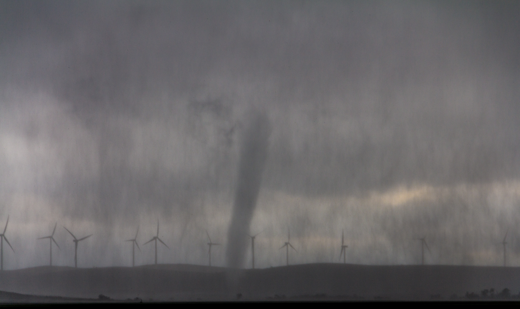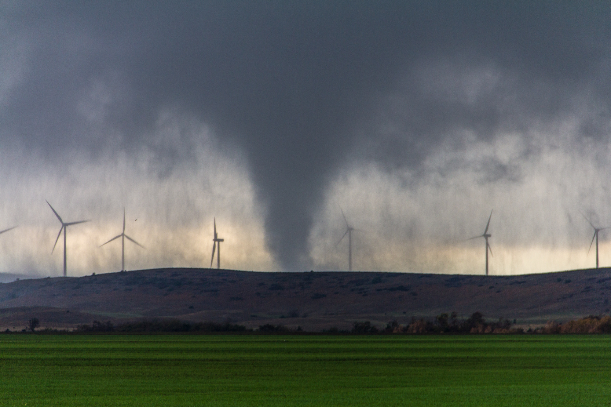 We started driving into the refuge, but traffic was going 35MPH. I knew there was no way we could keep up, so we decided to flip around and shoot up 54 to 19. We had to hook slice to get back on the storm, which had a bit of hail. Once we came out of the rain, we were seeing the tornado coming through the wildlife refuge near Saddle Mountain, OK. The tornado came over the mountain and went through the wind farm.