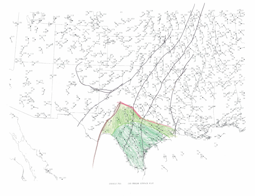 As can be seen on my hand analysis, the moisture didn’t get as far north as anticipated. We ended up south of I-20 near Dublin, TX on a supercell. Storm motions were pretty fast, and we managed to get over taken by the hail core.