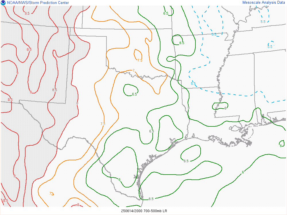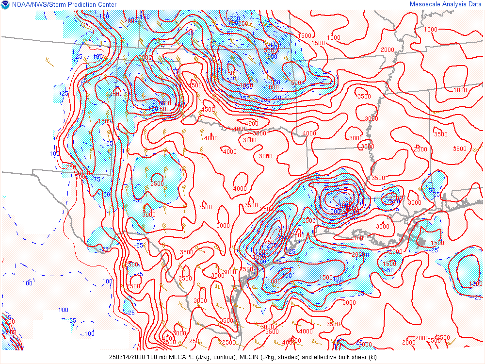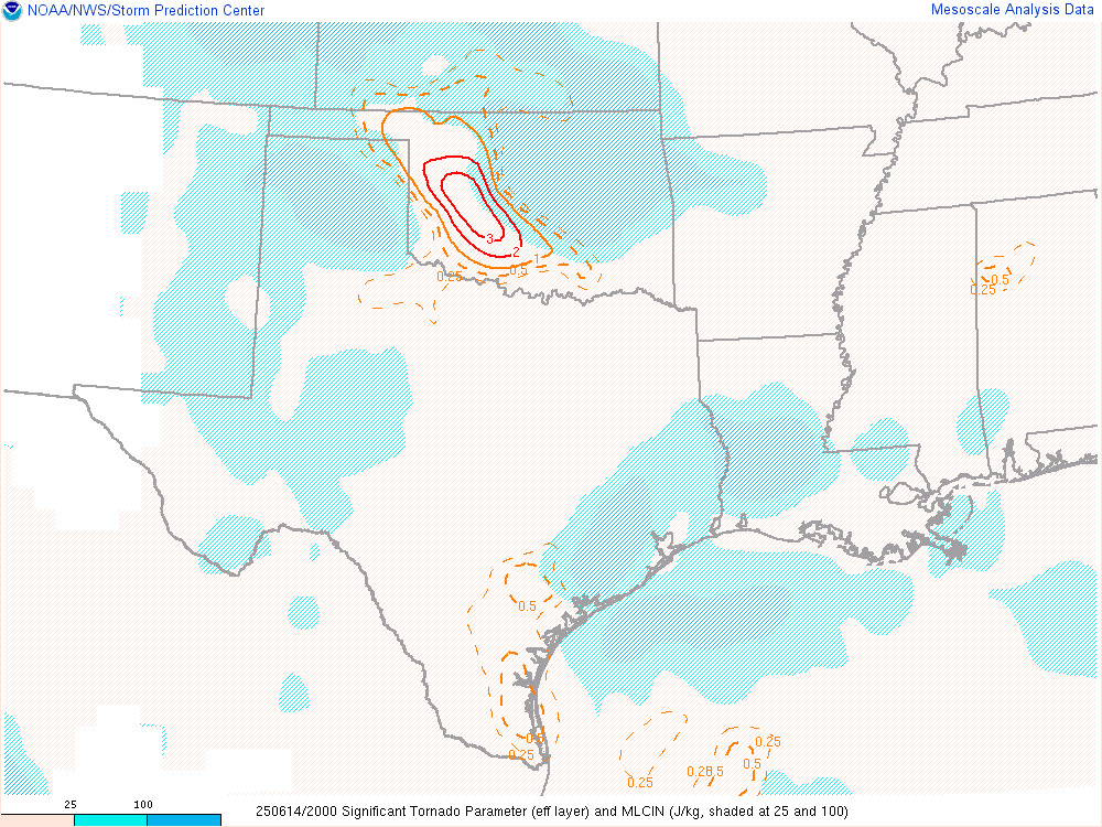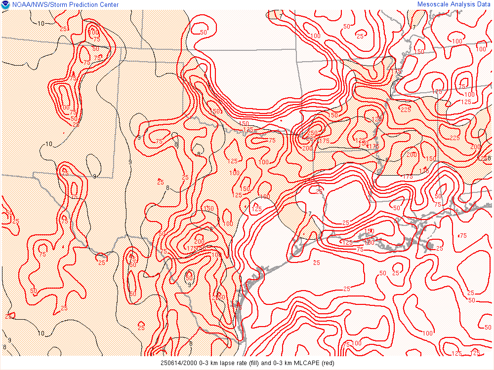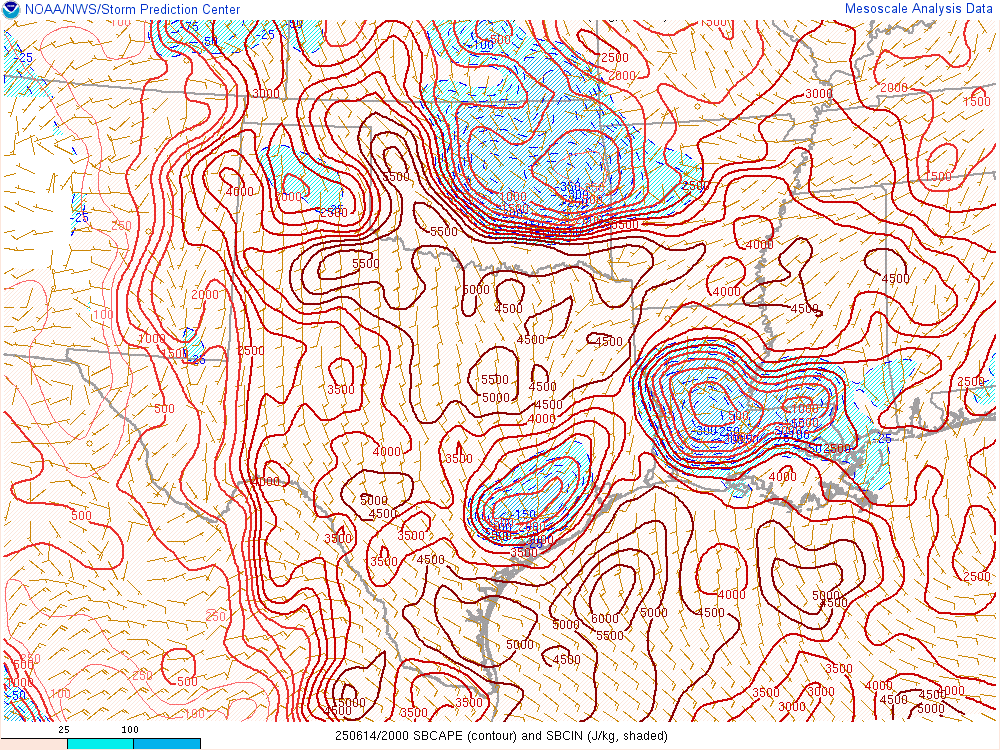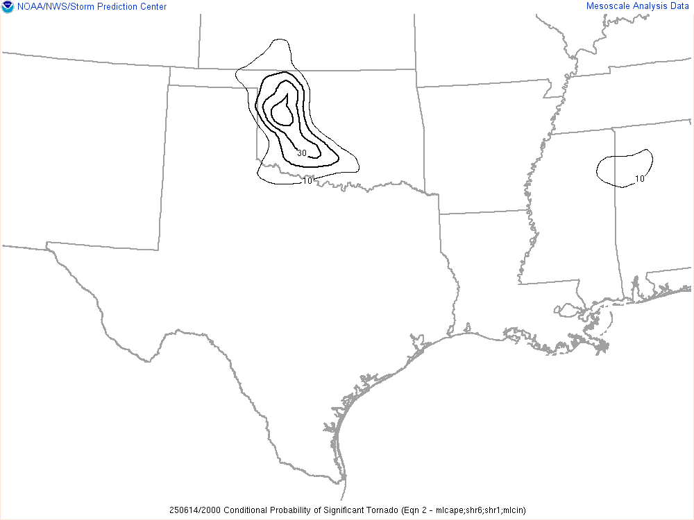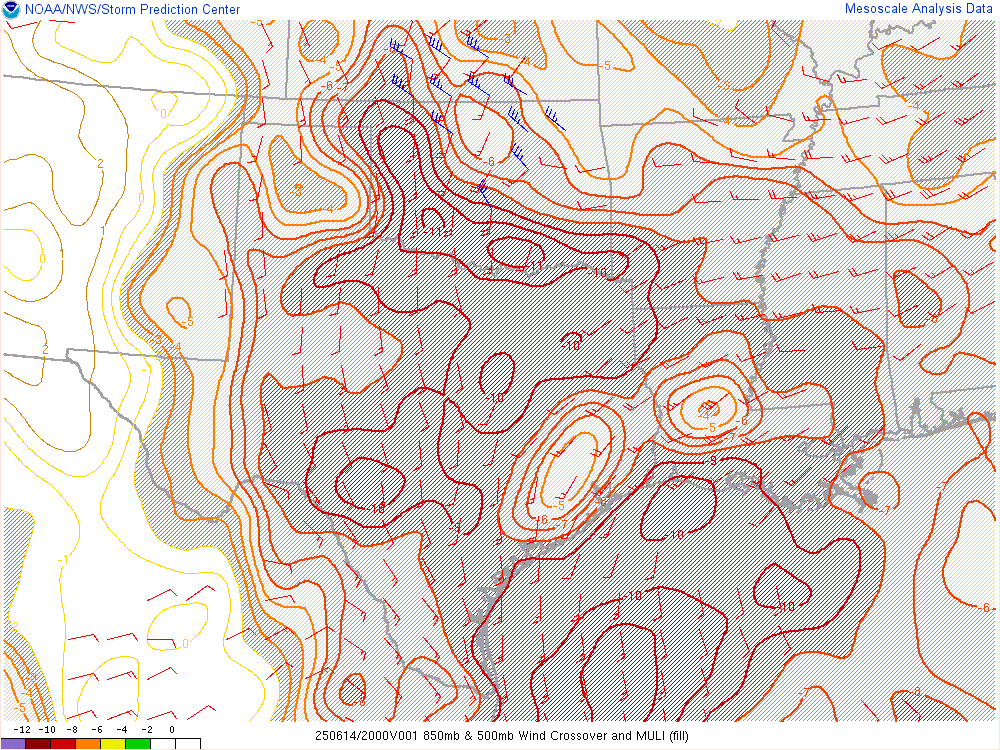 Not much of a forecast on this one as it was local and kind of a surprise day. As can be seen on the Mesoanalysis charts below, we had reasonably strong instability along an outflow boundary through Southern and Central/Western Oklahoma with a little bit of northwest 500mb flow.