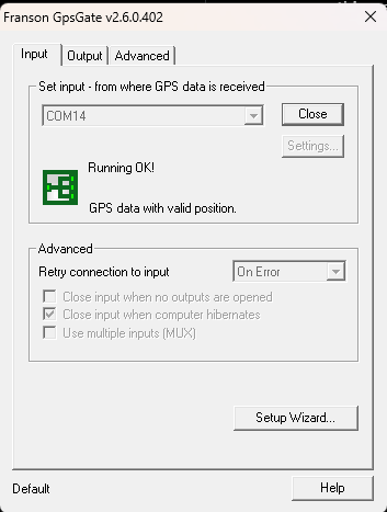 Once GPSGate Splitter is installed, you will want to get the input setup. There are plenty of documents to get it to work with your specific GPS puck. Once you have good input, you will receive a message of “GPS data with valid position” such as this