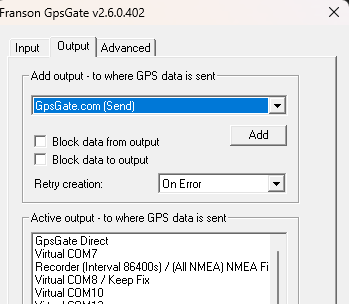 Setup the output tab with the URL you will be putting the perl script below. First click on GpsGate.com (Send) and click add.