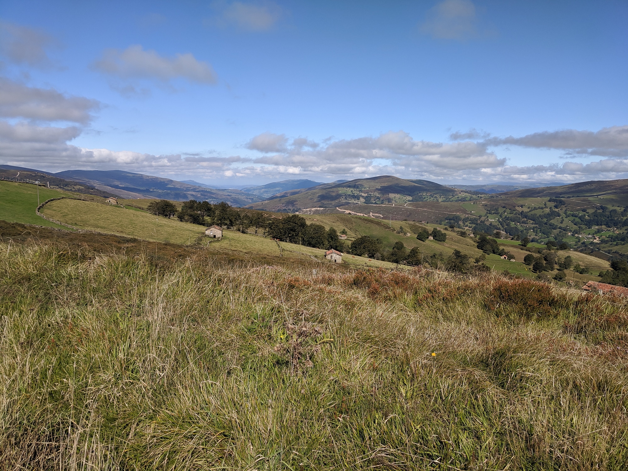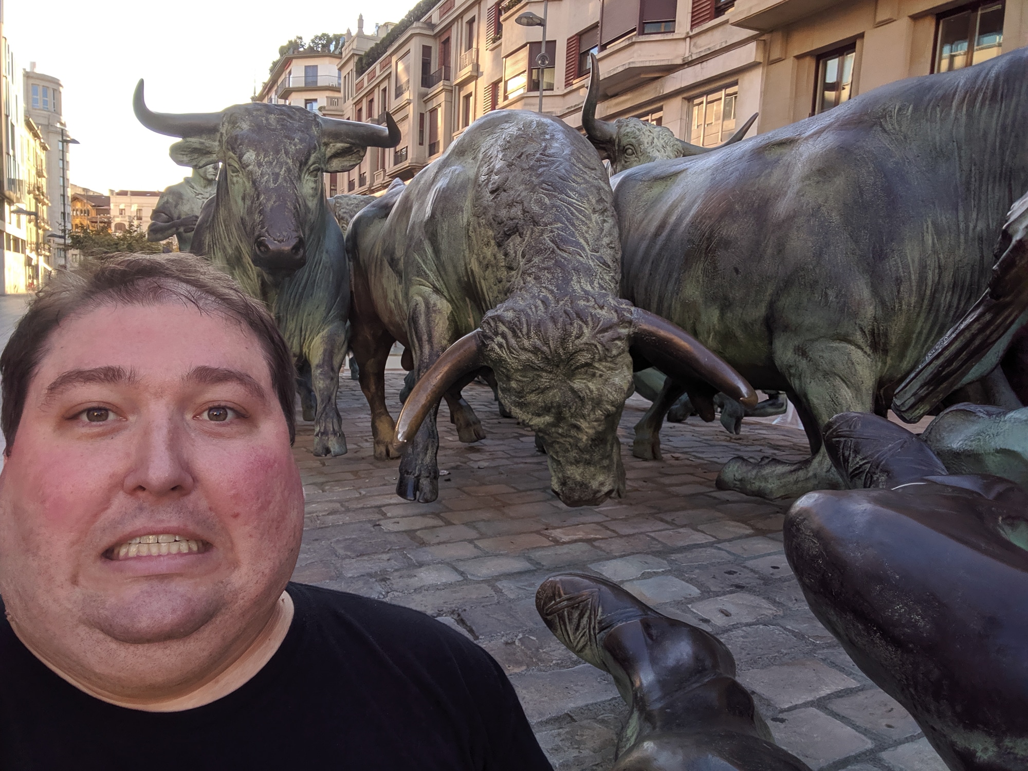 We drove to Pamplona on the first day, arriving in time to walk around downtown before sundown. It’s a beautiful Spanish city and located in some very pretty countryside. It’s famous for the running of the bulls, so I got a selfie with the statue.